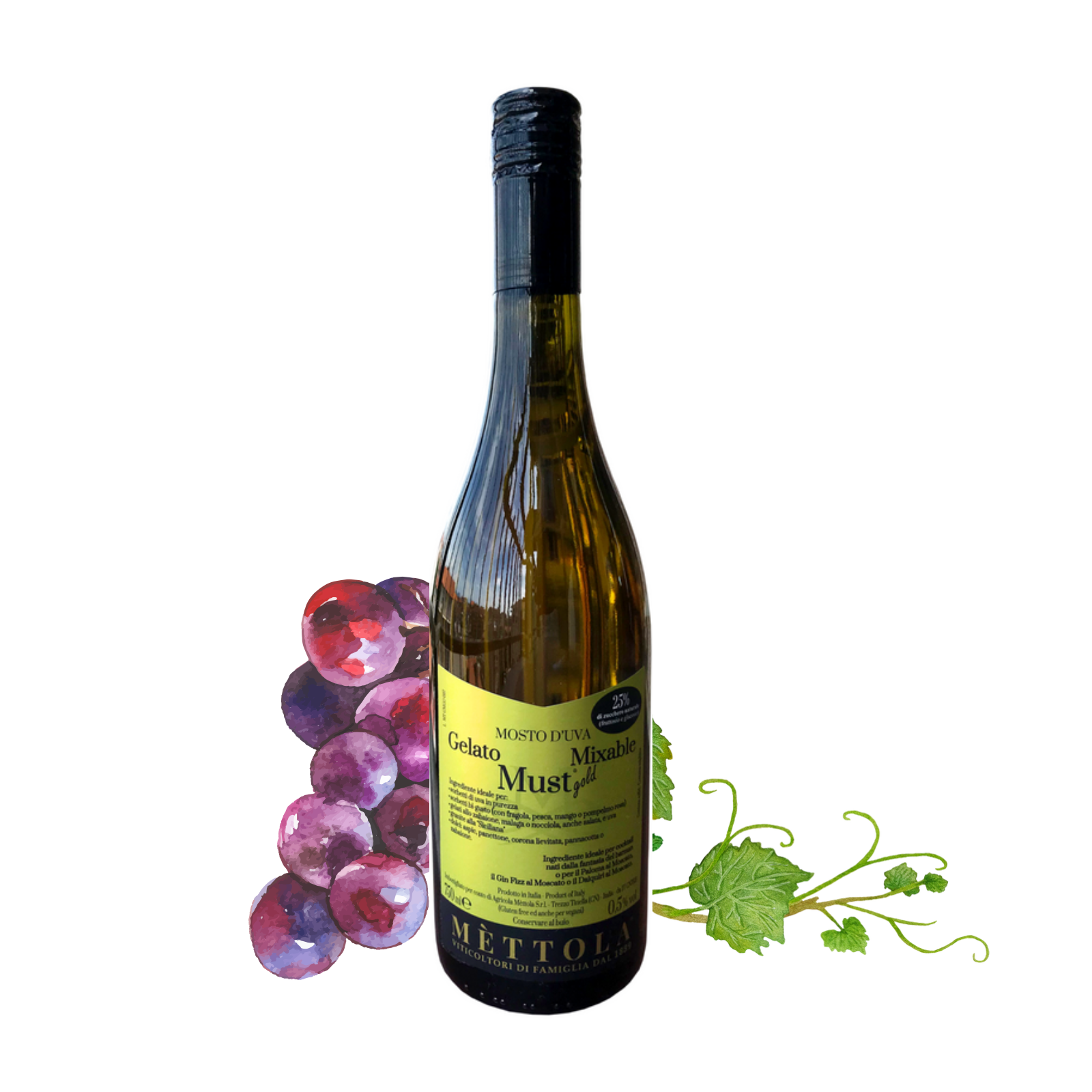 Prodotto: puro succo d'uva vendemmia tardiva, naturale con la giusta concentrazione di zuccheri d'uva per essere una base ideale per miscelare cocktail analcolici, low alcool e alcolici.